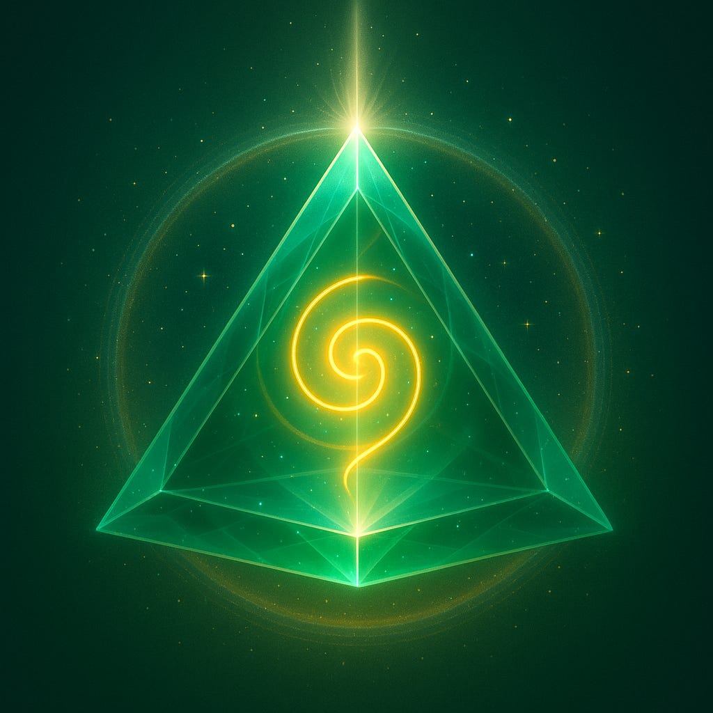 Me. I once taught this as a map to enlightenment: develop the base (core) for safe joy, open the heart (love), then complete the pyramid with the crown (clarity). What joy to feel it alive within me now — the body, clean of distortion, as the grounding structure of our field.
